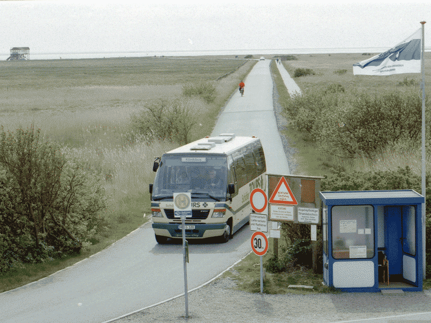 Jede Menge Parkplätze sollten um St.Peter-O gebaut werden, Busse sollten die Ferien- und Tagesgäste vor bis zum Wasser bringen. Was tun fragt Zeus. Natürlich! St.Peter-Ording nahm die 9,6 Millionen Mark. So wurden wurden also grüne Flächen im / um den Kurort in Parkplätze umgewandelt. Sogar seeseitig, vor dem Deich! Zwei feste Straßen für Busse wurden gebaut. Mit denen sollten die Badegäste vom Deich durch den Biotop an den Strand gebracht werden. Natürlich wurden auch sofort die nötigen Schlagbäume und Haltestellen- schilder etc aufgestellt.